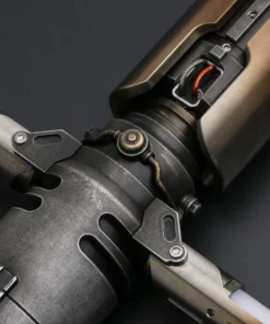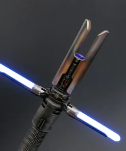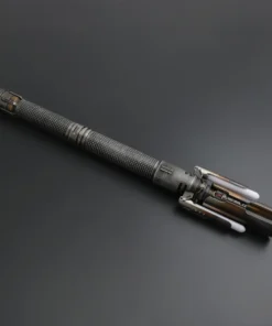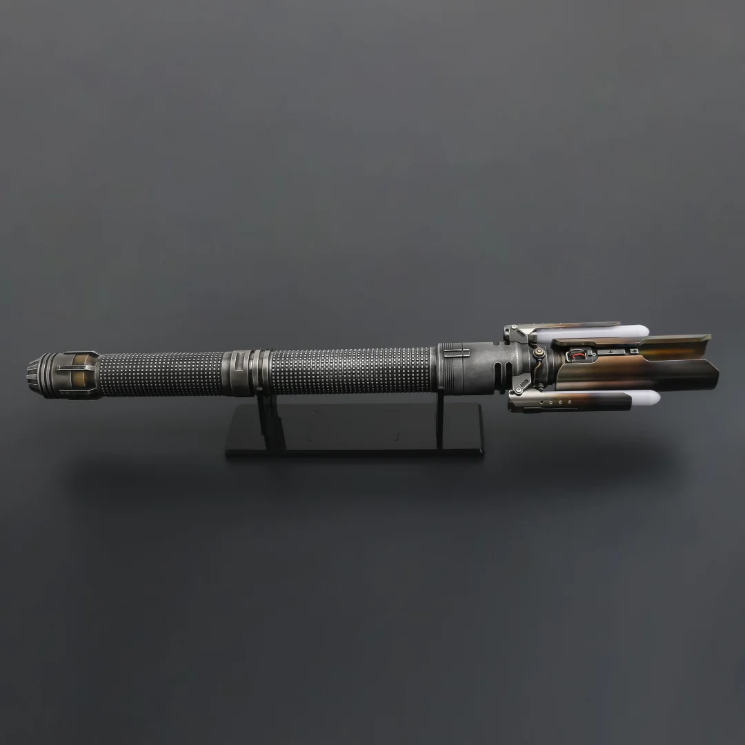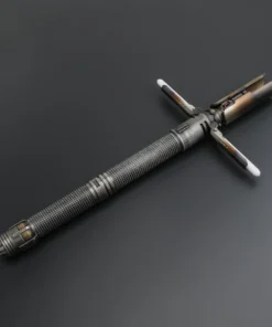 Cal Kestis Cross Guard saber. No denying the design and detail on this hilt! Weathered and heat discolouring, this saber is sure look amazing on any shelf. Fully electronic with several sound fonts and light colours. Comes with the hilt, blade, charger, standard tool kit and instruction booklet.