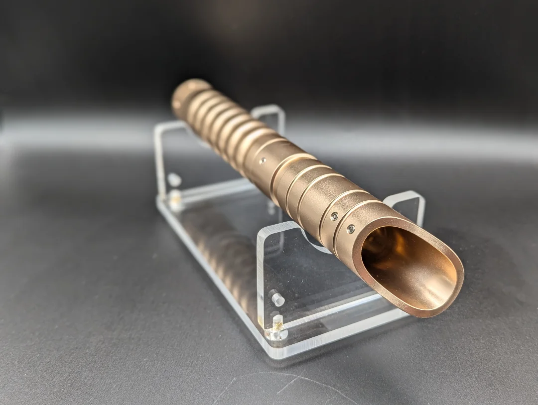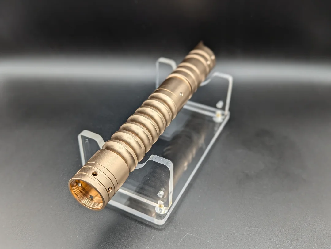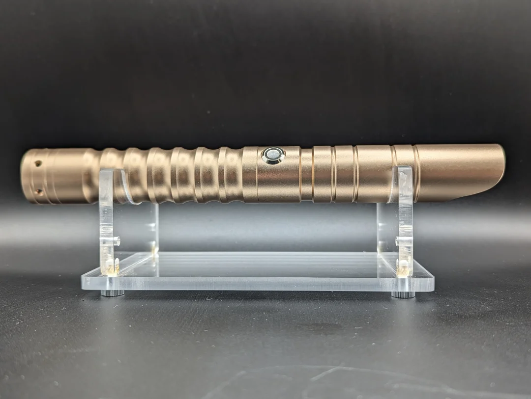 The Sincillo 16 saber is a simple yet effective hilt for the young padawan learner well on their way to knighthood. Designed for a sure grip, it also comes with a coupler to allow the connection of a second hilt to make a double bladed saber. Second hilt sold separately. This one is gold in colour and has a RGB S16 electronics core with several sound fonts and light colours. Comes with the hilt, 32 inch baselit blade, charger, standard tool kit and instruction booklet.