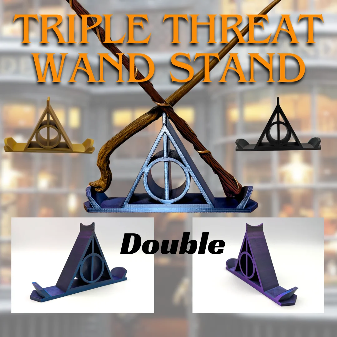 A Triple Threat wand display stand that holds up to two wands. A great way to display your wands to show off your collection. WANDS NOT INCLUDED. Colour options are available by request.